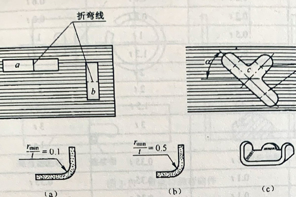 板料纖維與彎曲的關(guān)系3板料邊緣及表面狀態(tài)。彎曲件的壞料多用剪床下料或沖模落料方法制備,壞料邊緣有冷作硬化、毛刺,表面常有劃傷等缺陷。彎曲時,這些缺陷受拉應(yīng)力作用會引起應(yīng)力集中而導致破裂因此,彎曲前應(yīng)將毛刺和缺陷去除,彎曲時應(yīng)將有毛刺的邊緣放在彎曲區(qū)內(nèi)側(cè),使其受壓,避免彎裂,從而使最小相對彎曲半徑減小一些。